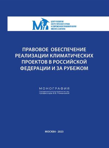 Правовое обеспечение реализации климатических проектов в Российской Федерации и за рубежом : монография / В. В. Романова, С. В. Конькова, А. М. Малик [и др.] ; под редакцией В. В. Романовой. — Москва : Научно-исследовательский «Центр развития энергетического права и современной правовой науки имени В.А. Мусина», 2023. — 560 c. — ISBN 978-5-6050-6679-8. — Текст : электронный // Цифровой образовательный ресурс IPR SMART : [сайт]. — URL: https://www.iprbookshop.ru/135233.html (дата обращения: 26.12.2023). — Режим доступа: для авторизир. пользователей