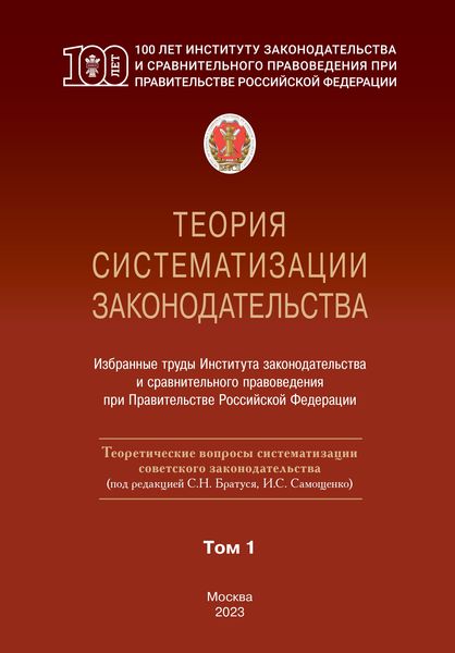 Теория систематизации законодательства. В 2 томах. Т.1. Теоретические вопросы систематизации советского законодательства / Д. А. Пашенцев, М. В. Залоило, А. С. Соминский [и др.] ; под редакцией С. Н. Братуся, И. С. Самощенко. — Москва : Институт законодательства и сравнительного правоведения при Правительстве Российской Федерации, Юриспруденция, 2023. — 576 c. — ISBN 978-5-9516-0919-9. — Текст : электронный // Цифровой образовательный ресурс IPR SMART : [сайт]. — URL: https://www.iprbookshop.ru/136082.html (дата обращения: 02.02.2024). — Режим доступа: для авторизир. пользователей