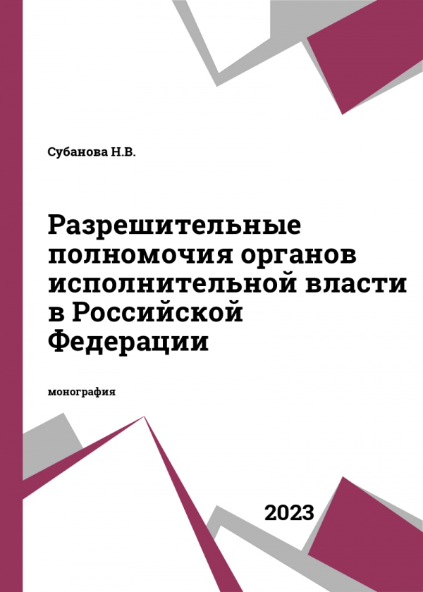 Субанова Н.В. Разрешительные полномочия органов исполнительной власти в Российской Федерации : монография / Субанова Н.В.. — Москва : Юриспруденция, 2023. — 286 c. — ISBN 978-5-9516-0568-9. — Текст : электронный // Цифровой образовательный ресурс IPR SMART : [сайт]. — URL: https://www.iprbookshop.ru/136099.html (дата обращения: 06.12.2025). — Режим доступа: для авторизир. пользователей