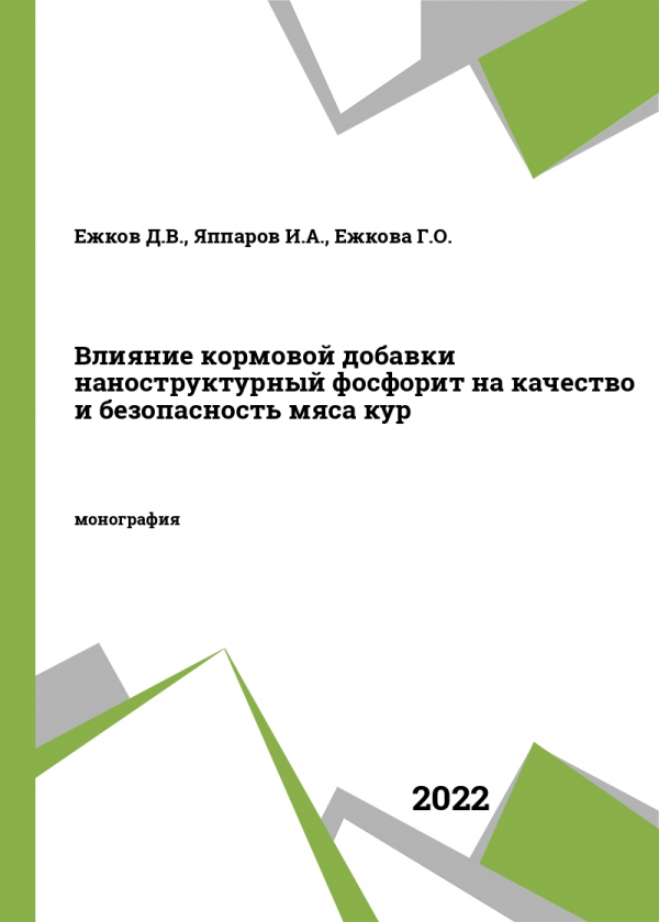 Ежков Д.В. Влияние кормовой добавки наноструктурный фосфорит на качество и безопасность мяса кур : монография / Ежков Д.В., Яппаров И.А., Ежкова Г.О.. — Казань : Издательство КНИТУ, 2022. — 100 c. — ISBN 978-5-7882-3310-9. — Текст : электронный // Цифровой образовательный ресурс IPR SMART : [сайт]. — URL: https://www.iprbookshop.ru/136146.html (дата обращения: 05.12.2025). — Режим доступа: для авторизир. пользователей
