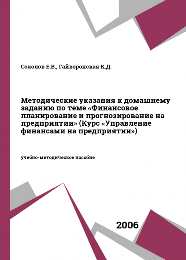 Соколов Е.В. Методические указания к домашнему заданию по теме «Финансовое планирование и прогнозирование на предприятии» (Курс «Управление финансами на предприятии») / Соколов Е.В., Гайворонская К.Д.. — Москва : Московский государственный технический университет имени Н.Э. Баумана, 2006. — 96 c. — ISBN 5-7038-2842-2. — Текст : электронный // Цифровой образовательный ресурс IPR SMART : [сайт]. — URL: https://www.iprbookshop.ru/136291.html (дата обращения: 18.12.2025). — Режим доступа: для авторизир. пользователей