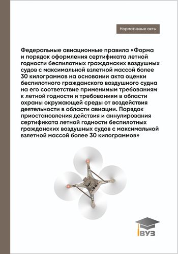 Федеральные авиационные правила «Форма и порядок оформления сертификата летной годности беспилотных гражданских воздушных судов с максимальной взлетной массой более 30 килограммов на основании акта оценки беспилотного гражданского воздушного судна на его соответствие применимым требованиям к летной годности и требованиям в области охраны окружающей среды от воздействия деятельности в области авиации. Порядок приостановления действия и аннулирования сертификата летной годности беспилотных гражданских воздушных судов с максимальной взлетной массой более 30 килограммов». — Саратов : Вузовское образование, 2024. — 17 c. — ISBN 978-5-4487-0961-6. — Текст : электронный // Цифровой образовательный ресурс IPR SMART : [сайт]. — URL: https://www.iprbookshop.ru/137365.html (дата обращения: 15.03.2024). — Режим доступа: для авторизир. пользователей