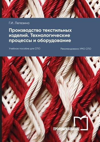 Легезина, Г. И. Производство текстильных изделий. Технологические процессы и оборудование : учебное пособие для СПО / Г. И. Легезина. — Саратов, Москва : Профобразование, Ай Пи Ар Медиа, 2024. — 136 c. — ISBN 978-5-4488-1918-6, 978-5-4497-2807-4. — Текст : электронный // Цифровой образовательный ресурс IPR SMART : [сайт]. — URL: https://www.iprbookshop.ru/138073.html (дата обращения: 07.05.2024). — Режим доступа: для авторизир. пользователей