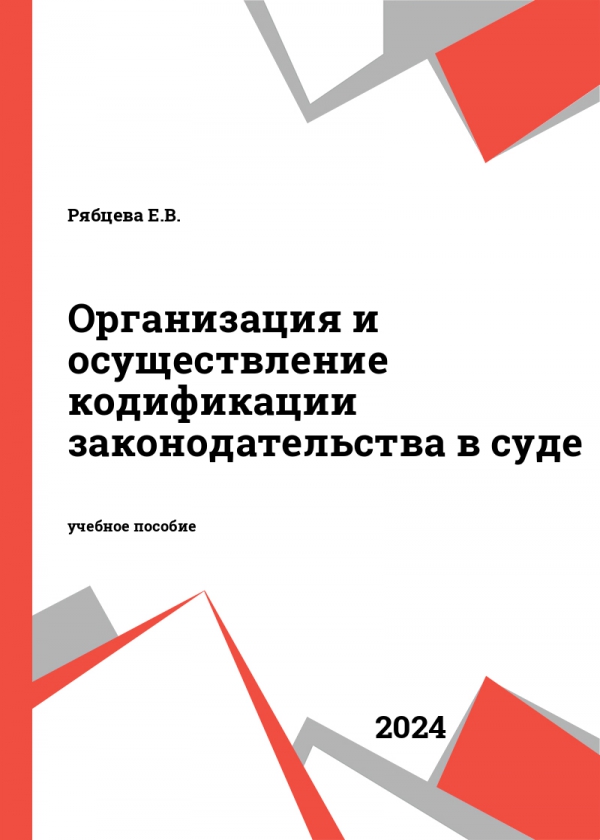 Рябцева Е.В. Организация и осуществление кодификации законодательства в суде : учебное пособие / Рябцева Е.В.. — Москва : Российский государственный университет правосудия, 2024. — 64 c. — ISBN 978-5-93916-649-2. — Текст : электронный // Цифровой образовательный ресурс IPR SMART : [сайт]. — URL: https://www.iprbookshop.ru/138205.html (дата обращения: 06.12.2025). — Режим доступа: для авторизир. пользователей