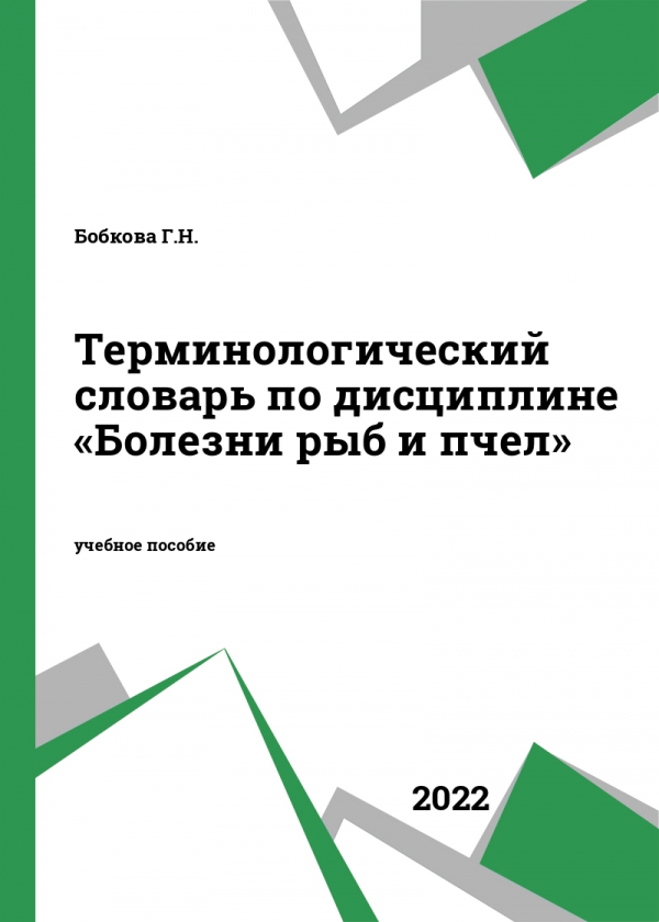 Бобкова, Г. Н. Терминологический словарь по дисциплине «Болезни рыб и пчел» : учебное пособие к практическим занятиям и самостоятельной работы для студентов очной и заочной формы обучения, обучающихся по специальности 36.05.01 – «Ветеринария» / Г. Н. Бобкова. — Брянск : Брянский государственный аграрный университет, 2022. — 39 c. — Текст : электронный // Цифровой образовательный ресурс IPR SMART : [сайт]. — URL: https://www.iprbookshop.ru/138262.html (дата обращения: 26.04.2024). — Режим доступа: для авторизир. пользователей