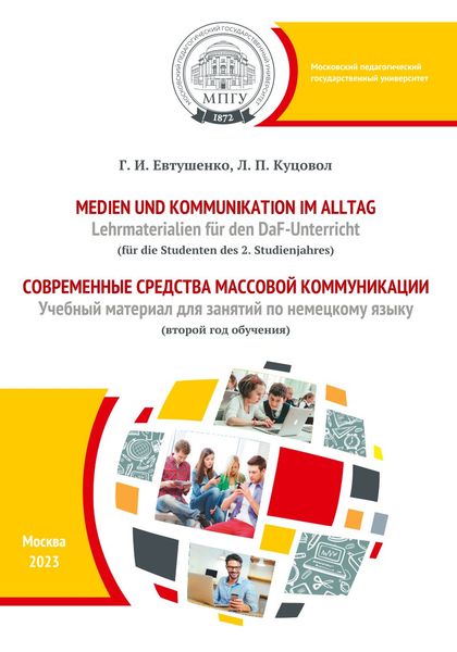 Евтушенко, Г. И. Medien und Kommunikation im Alltag. Lehrmaterialien für den DaF-Unterricht (für die Studenten des 2. Studienjahres) = Современные средства массовой коммуникации. Учебный материал для занятий по немецкому языку (второй год обучения) : учебное пособие / Г. И. Евтушенко, Л. П. Куцовол. — Москва : Московский педагогический государственный университет, 2023. — 88 c. — ISBN 978-5-4263-1252-4. — Текст : электронный // Цифровой образовательный ресурс IPR SMART : [сайт]. — URL: https://www.iprbookshop.ru/139155.html (дата обращения: 13.05.2024). — Режим доступа: для авторизир. пользователей
