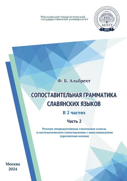 Альбрехт, Ф. Б. Сопоставительная грамматика славянских языков. В 2 частях. Ч.2. Русские непродуктивные глагольные классы в систематическом сопоставлении с инославянскими (презентная основа) : учебное пособие / Ф. Б. Альбрехт. — Москва : Московский педагогический государственный университет, 2024. — 152 c. — ISBN 978-5-4263-1338-5. — Текст : электронный // Цифровой образовательный ресурс IPR SMART : [сайт]. — URL: https://www.iprbookshop.ru/139198.html (дата обращения: 14.05.2024). — Режим доступа: для авторизир. пользователей