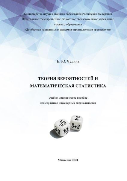 Чудина, Е. Ю. Теория вероятностей и математическая статистика : учебно-методическое пособие для студентов инженерных специальностей / Е. Ю. Чудина. — Макеевка : Донбасская национальная академия строительства и архитектуры, ЭБС АСВ, 2024. — 149 c. — Текст : электронный // Цифровой образовательный ресурс IPR SMART : [сайт]. — URL: https://www.iprbookshop.ru/139435.html (дата обращения: 20.05.2024). — Режим доступа: для авторизир. пользователей