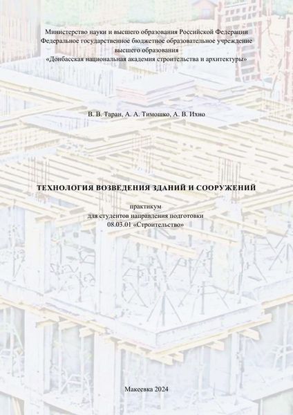 Таран, В. В. Технология возведения зданий и сооружений : практикум для студентов направления подготовки 08.03.01 «Строительство» / В. В. Таран, А. А. Тимошко, А. В. Ихно. — Макеевка : Донбасская национальная академия строительства и архитектуры, ЭБС АСВ, 2024. — 62 c. — Текст : электронный // Цифровой образовательный ресурс IPR SMART : [сайт]. — URL: https://www.iprbookshop.ru/139436.html (дата обращения: 20.05.2024). — Режим доступа: для авторизир. пользователей