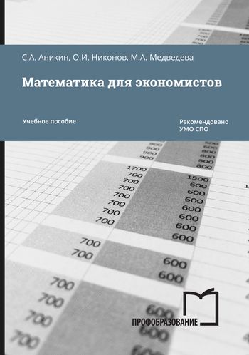 Аникин, С. А. Математика для экономистов : учебное пособие для СПО / С. А. Аникин, О. И. Никонов, М. А. Медведева ; под редакцией Х. Н. Астафьева. — 3-е изд. — Саратов, Екатеринбург : Профобразование, Уральский федеральный университет, 2024. — 72 c. — ISBN 978-5-4488-0394-9, 978-5-7996-2869-7. — Текст : электронный // Цифровой образовательный ресурс IPR SMART : [сайт]. — URL: https://www.iprbookshop.ru/139556.html (дата обращения: 23.05.2024). — Режим доступа: для авторизир. пользователей