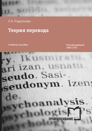 Родионова, Л. З. Теория перевода : учебное пособие для СПО / Л. З. Родионова ; под редакцией А. А. Шагеевой. — 3-е изд. — Саратов, Екатеринбург : Профобразование, Уральский федеральный университет, 2024. — 38 c. — ISBN 978-5-4488-0498-4, 978-5-7996-2913-7. — Текст : электронный // Цифровой образовательный ресурс IPR SMART : [сайт]. — URL: https://www.iprbookshop.ru/139624.html (дата обращения: 23.05.2024). — Режим доступа: для авторизир. пользователей