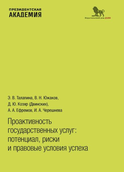 Проактивность государственных услуг: потенциал, риски и правовые условия успеха / Э. В. Талапина, В. Н. Южаков, Козяр Д. Ю. (Двинских) [и др.]. — Москва : Дело, 2023. — 202 c. — ISBN 978-5-85006-478-5. — Текст : электронный // Цифровой образовательный ресурс IPR SMART : [сайт]. — URL: https://www.iprbookshop.ru/139805.html (дата обращения: 27.05.2024). — Режим доступа: для авторизир. пользователей