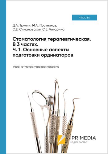Стоматология терапевтическая. В 3 частях. Ч. 1. Основные аспекты подготовки ординаторов : учебно-методическое пособие / Д. А. Трунин, М. А. Постников, О. Е. Симановская, С. Е. Чигарина. — Москва : Ай Пи Ар Медиа, 2024. — 264 c. — ISBN 978-5-4497-2879-1 (ч. 1), 978-5-4497-2878-4. — Текст : электронный // Цифровой образовательный ресурс IPR SMART : [сайт]. — URL: https://www.iprbookshop.ru/139963.html (дата обращения: 28.06.2024). — Режим доступа: для авторизир. пользователей