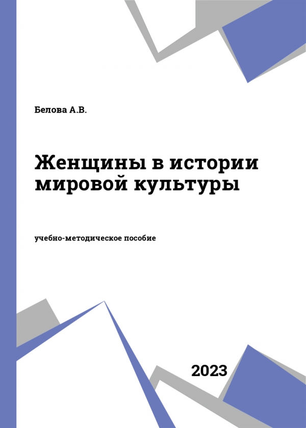 Белова А.В. Женщины в истории мировой культуры : учебно-методическое пособие для студентов 4 курса очной формы обучения направления 46.03.01 История профиля «Социокультурная история» / Белова А.В.. — Тверь : Тверской государственный университет, 2023. — 148 c. — ISBN 978-5-7609-1873-4. — Текст : электронный // Цифровой образовательный ресурс IPR SMART : [сайт]. — URL: https://www.iprbookshop.ru/140056.html (дата обращения: 08.12.2025). — Режим доступа: для авторизир. пользователей