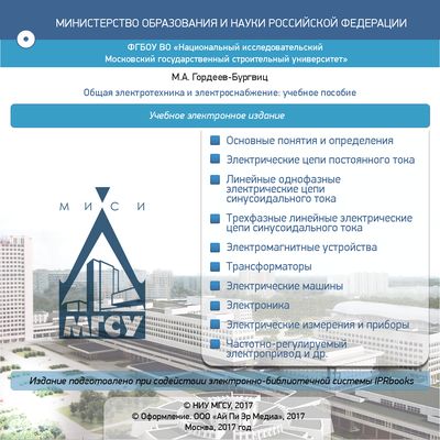 Гордеев-Бургвиц, М. А. Общая электротехника и электроснабжение : учебное пособие / М. А. Гордеев-Бургвиц. — Москва : МИСИ-МГСУ, Ай Пи Ар Медиа, ЭБС АСВ, 2024. — 470 c. — ISBN 978-5-7264-3475-9. — Текст : электронный // Цифровой образовательный ресурс IPR SMART : [сайт]. — URL: https://www.iprbookshop.ru/140492.html (дата обращения: 08.08.2024). — Режим доступа: для авторизир. пользователей