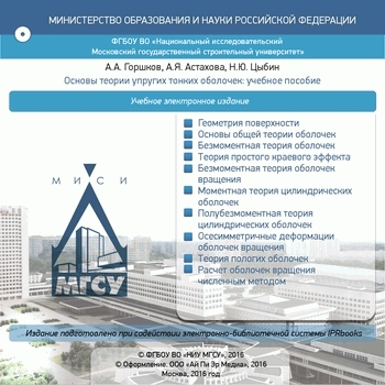 Горшков, А. А. Основы теории упругих тонких оболочек : учебное пособие / А. А. Горшков, А. Я. Астахова, Н. Ю. Цыбин ; под редакцией А. А. Горшкова. — Москва : МИСИ-МГСУ, Ай Пи Ар Медиа, ЭБС АСВ, 2024. — 231 c. — ISBN 978-5-7264-3442-1. — Текст : электронный // Цифровой образовательный ресурс IPR SMART : [сайт]. — URL: https://www.iprbookshop.ru/140496.html (дата обращения: 08.08.2024). — Режим доступа: для авторизир. пользователей