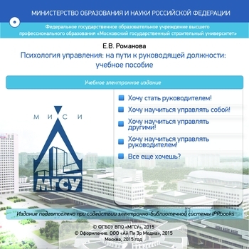 Романова, Е. В. Психология управления: на пути к руководящей должности : учебное пособие / Е. В. Романова. — Москва : МИСИ-МГСУ, Ай Пи Ар Медиа, ЭБС АСВ, 2024. — 136 c. — ISBN 978-5-7264-3462-9. — Текст : электронный // Цифровой образовательный ресурс IPR SMART : [сайт]. — URL: https://www.iprbookshop.ru/140509.html (дата обращения: 08.08.2024). — Режим доступа: для авторизир. пользователей