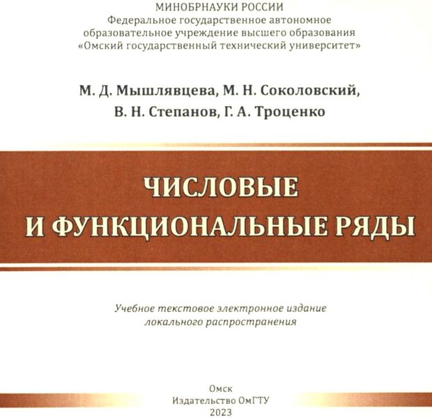 Числовые и функциональные ряды : учебное пособие / М. Д. Мышлявцева, М. Н. Соколовский, В. Н. Степанов, Г. А. Троценко. — Омск : Омский государственный технический университет, 2023. — 215 c. — ISBN 978-5-8149-3690-5. — Текст : электронный // Цифровой образовательный ресурс IPR SMART : [сайт]. — URL: https://www.iprbookshop.ru/140879.html (дата обращения: 27.06.2024). — Режим доступа: для авторизир. пользователей