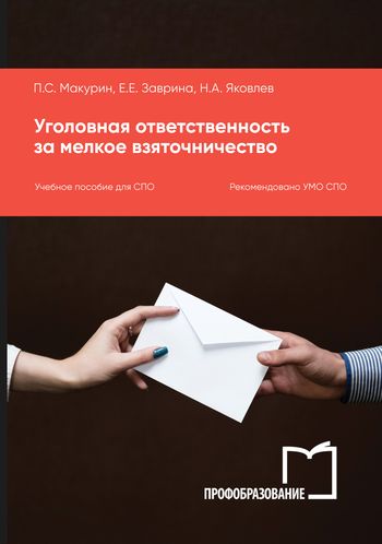 Макурин, П. С. Уголовная ответственность за мелкое взяточничество : учебное пособие для СПО / П. С. Макурин, Е. Е. Заврина, Н. А. Яковлев. — Липецк, Саратов : Липецкий государственный технический университет, Профобразование, 2024. — 70 c. — ISBN 978-5-00175-271-4, 978-5-4488-2068-7. — Текст : электронный // Цифровой образовательный ресурс IPR SMART : [сайт]. — URL: https://www.iprbookshop.ru/141026.html (дата обращения: 09.08.2024). — Режим доступа: для авторизир. пользователей