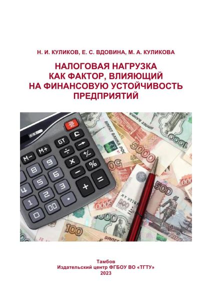 Куликов, Н. И. Налоговая нагрузка как фактор, влияющий на финансовую устойчивость предприятий : монография / Н. И. Куликов, Е. С. Вдовина, М. А. Куликова. — Тамбов : Тамбовский государственный технический университет, ЭБС АСВ, 2023. — 80 c. — ISBN 978-5-8265-2717-7. — Текст : электронный // Цифровой образовательный ресурс IPR SMART : [сайт]. — URL: https://www.iprbookshop.ru/141059.html (дата обращения: 04.07.2024). — Режим доступа: для авторизир. пользователей