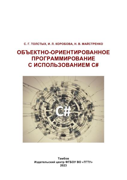 Толстых, С. Г. Объектно-ориентированное программирование с использованием С# : учебное пособие / С. Г. Толстых, И. Л. Коробова, Н. В. Майстренко. — Тамбов : Тамбовский государственный технический университет, ЭБС АСВ, 2023. — 80 c. — ISBN 978-5-8265-2615-6. — Текст : электронный // Цифровой образовательный ресурс IPR SMART : [сайт]. — URL: https://www.iprbookshop.ru/141062.html (дата обращения: 04.07.2024). — Режим доступа: для авторизир. пользователей