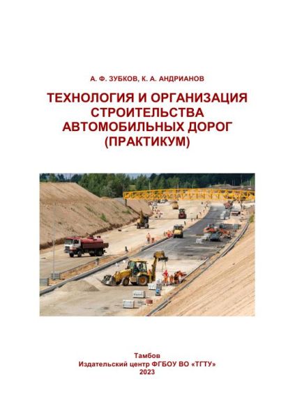 Зубков, А. Ф. Технология и организация строительства автомобильных дорог (Практикум) : учебное пособие / А. Ф. Зубков, К. А. Андрианов. — Тамбов : Тамбовский государственный технический университет, ЭБС АСВ, 2023. — 97 c. — ISBN 978-5-8265-2594-4. — Текст : электронный // Цифровой образовательный ресурс IPR SMART : [сайт]. — URL: https://www.iprbookshop.ru/141096.html (дата обращения: 04.07.2024). — Режим доступа: для авторизир. пользователей