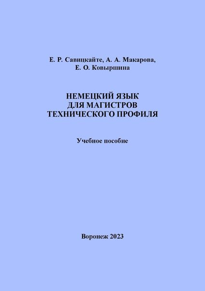 Савицкайте, Е. Р. Немецкий язык для магистров технического профиля : учебное пособие / Е. Р. Савицкайте, А. А. Макарова, Е. О. Ковыршина. — Воронеж : Воронежский государственный технический университет, ЭБС АСВ, 2023. — 206 c. — ISBN 978-5-7731-1098-9. — Текст : электронный // Цифровой образовательный ресурс IPR SMART : [сайт]. — URL: https://www.iprbookshop.ru/141239.html (дата обращения: 10.07.2024). — Режим доступа: для авторизир. пользователей
