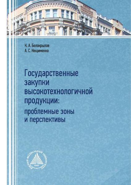 Белокрылов, К. А. Государственные закупки высокотехнологичной продукции: проблемные зоны и перспективы : монография / К. А. Белокрылов, А. С. Нещименко ; под редакцией О. С. Белокрыловой. — Ростов-на-Дону, Таганрог : Издательство Южного федерального университета, 2023. — 110 c. — ISBN 978-5-9275-4584-1. — Текст : электронный // Цифровой образовательный ресурс IPR SMART : [сайт]. — URL: https://www.iprbookshop.ru/141412.html (дата обращения: 17.07.2024). — Режим доступа: для авторизир. пользователей