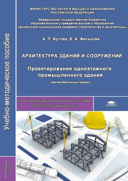 Бутова, А. П. Архитектура зданий и сооружений. Проектирование одноэтажного промышленного здания (стальной каркас) : учебно-методическое пособие для обучающихся направления подготовки 08.03.01 «Строительство» / А. П. Бутова, Е. А. Феськова. — Макеевка : Донбасская национальная академия строительства и архитектуры, ЭБС АСВ, 2024. — 118 c. — Текст : электронный // Цифровой образовательный ресурс IPR SMART : [сайт]. — URL: https://www.iprbookshop.ru/141648.html (дата обращения: 23.07.2024). — Режим доступа: для авторизир. пользователей
