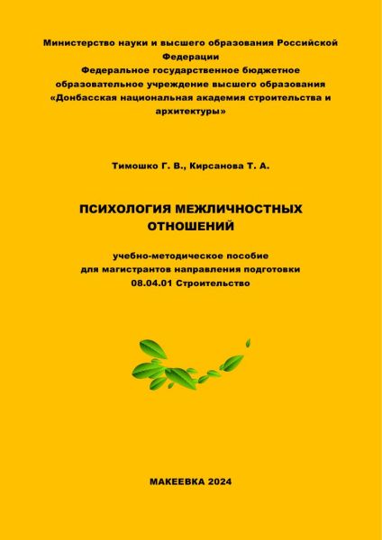 Тимошко, Г. В. Психология межличностных отношений : учебно-методическое пособие для магистрантов направления подготовки 08.04.01 Строительство / Г. В. Тимошко, Т. А. Кирсанова. — Макеевка : Донбасская национальная академия строительства и архитектуры, ЭБС АСВ, 2024. — 118 c. — Текст : электронный // Цифровой образовательный ресурс IPR SMART : [сайт]. — URL: https://www.iprbookshop.ru/141655.html (дата обращения: 23.07.2024). — Режим доступа: для авторизир. пользователей