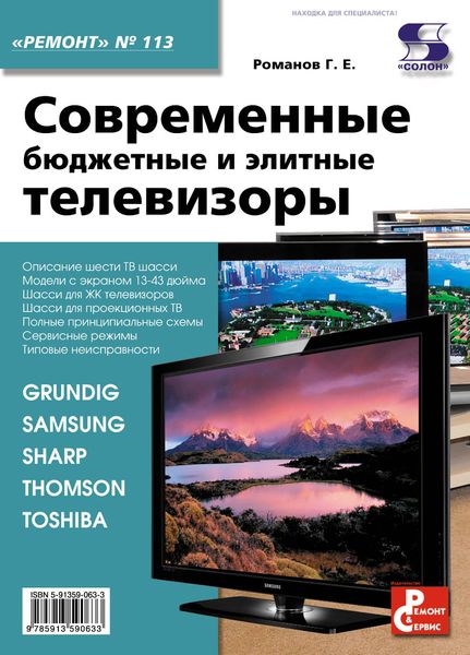 Книга содержит подробное описание как бюджетных (доступных широкому кругу покупателей), так и элитных моделей современных телевизоров ведущих фирм-производителей GRUNDIG, SAMSUNG, SHARP, THOMSON и TOSHIBA, рассмотрены методы их ремонта и регулировки. Впервые описаны цветные проекционные телевизоры «Toshiba 43A9UE/UA». Книга предназначена для специалистов-ремонтников и радиолюбителей, интересующихся телевизионной тематикой.
