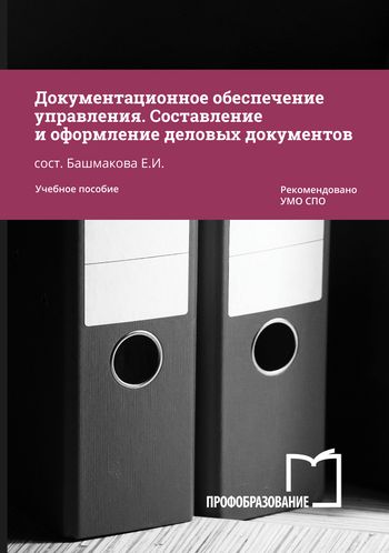 Документационное обеспечение управления. Составление и оформление деловых документов : учебное пособие для СПО / составители Е. И. Башмакова. — 2-е изд. — Саратов, Москва : Профобразование, Ай Пи Ар Медиа, 2024. — 144 c. — ISBN 978-5-4488-2168-4, 978-5-4497-3412-9. — Текст : электронный // Цифровой образовательный ресурс IPR SMART : [сайт]. — URL: https://www.iprbookshop.ru/142218.html (дата обращения: 08.08.2024). — Режим доступа: для авторизир. пользователей