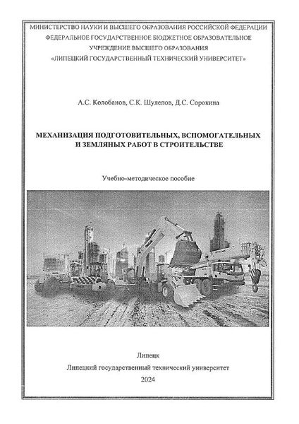 Колобанов, А. С. Механизация подготовительных, вспомогательных и земляных работ в строительстве : учебно-методическое пособие / А. С. Колобанов, С. К. Шулепов, Д. С. Сорокина. — Липецк : Липецкий государственный технический университет, ЭБС АСВ, 2024. — 59 c. — ISBN 978-5-00175-274-5. — Текст : электронный // Цифровой образовательный ресурс IPR SMART : [сайт]. — URL: https://www.iprbookshop.ru/143977.html (дата обращения: 07.10.2024). — Режим доступа: для авторизир. пользователей