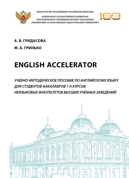 Гридасова, А. В. English Accelerator : учебно-методическое пособие по английскому языку для студентов-бакалавров 1-х курсов неязыковых факультетов высших учебных заведений / А. В. Гридасова, М. А. Гринько. — Армавир : Армавирский государственный педагогический университет, 2024. — 116 c. — ISBN 978-5-89971-961-5. — Текст : электронный // Цифровой образовательный ресурс IPR SMART : [сайт]. — URL: https://www.iprbookshop.ru/144331.html (дата обращения: 14.10.2024). — Режим доступа: для авторизир. пользователей