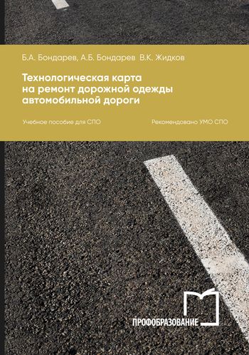 Бондарев, Б. А. Технологическая карта на ремонт дорожной одежды автомобильной дороги : учебное пособие для СПО / Б. А. Бондарев, А. Б. Бондарев, В. К. Жидков. — 2-е изд. — Липецк, Саратов : Липецкий государственный технический университет, Профобразование, 2024. — 74 c. — ISBN 978-5-00175-283-7, 978-5-4488-2299-5. — Текст : электронный // Цифровой образовательный ресурс IPR SMART : [сайт]. — URL: https://www.iprbookshop.ru/144765.html (дата обращения: 20.11.2024). — Режим доступа: для авторизир. пользователей
