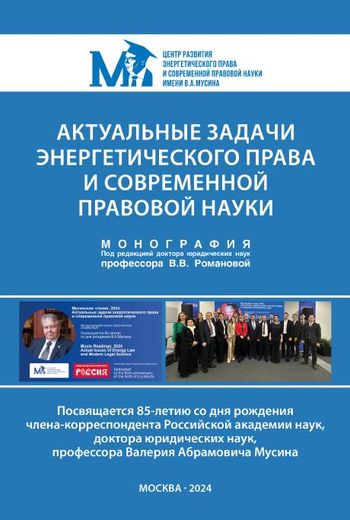 Актуальные задачи энергетического права и современной правовой науки : монография / В.В. Романова [и др.].. — Москва : Научно-исследовательский «Центр развития энергетического права и современной правовой науки имени В.А. Мусина», 2024. — 400 c. — ISBN 978-5-6050667-8-1. — Текст : электронный // Цифровой образовательный ресурс IPR SMART : [сайт]. — URL: https://www.iprbookshop.ru/145199.html (дата обращения: 19.12.2025). — Режим доступа: для авторизир. пользователей