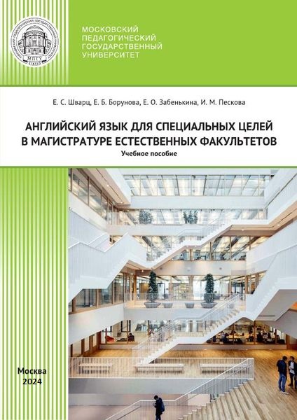 Английский язык для специальных целей в магистратуре естественных факультетов = English for Special Purposes for Master Degree Programmes of Science Departments : учебное пособие / Е. С. Шварц, Е. Б. Борунова, Е. О. Забенькина, И. М. Пескова. — 2-е изд. — Москва : Московский педагогический государственный университет, 2024. — 120 c. — ISBN 978-5-4263-0878-7. — Текст : электронный // Цифровой образовательный ресурс IPR SMART : [сайт]. — URL: https://www.iprbookshop.ru/145413.html (дата обращения: 13.11.2024). — Режим доступа: для авторизир. пользователей