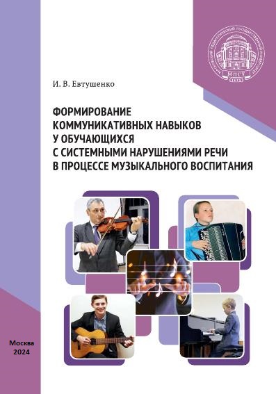 Евтушенко, И. В. Формирование коммуникативных навыков у обучающихся с системными нарушениями речи в процессе музыкального воспитания : монография / И. В. Евтушенко. — 2-е изд. — Москва : Московский педагогический государственный университет, 2024. — 172 c. — ISBN 978-5-4263-0872-5. — Текст : электронный // Цифровой образовательный ресурс IPR SMART : [сайт]. — URL: https://www.iprbookshop.ru/145427.html (дата обращения: 13.11.2024). — Режим доступа: для авторизир. пользователей