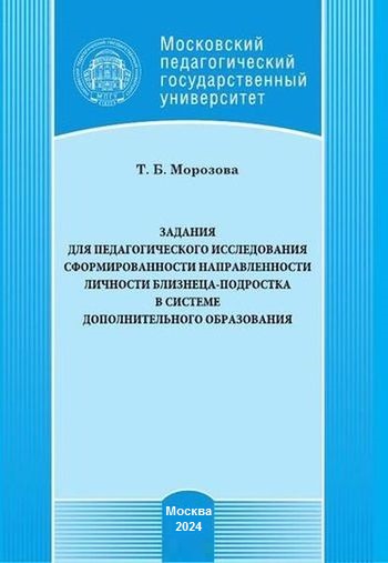 Морозова, Т. Б. Задания для педагогического исследования сформированности направленности личности близнеца-подростка в системе дополнительного образования : методические рекомендации / Т. Б. Морозова ; под редакцией Е. И. Артамоновой. — 2-е изд. — Москва : Московский педагогический государственный университет, 2024. — 166 c. — ISBN 978-5-4263-0533-5. — Текст : электронный // Цифровой образовательный ресурс IPR SMART : [сайт]. — URL: https://www.iprbookshop.ru/146110.html (дата обращения: 01.12.2024). — Режим доступа: для авторизир. пользователей