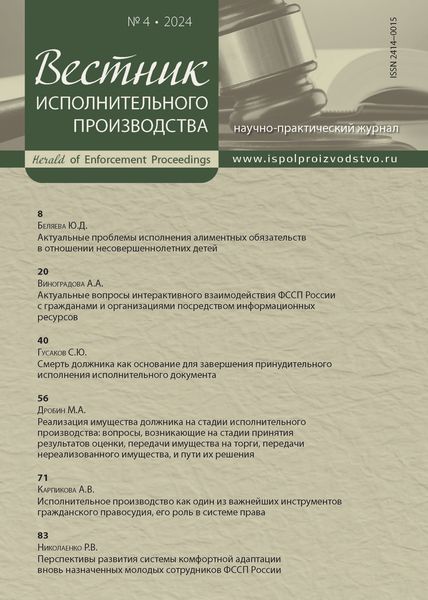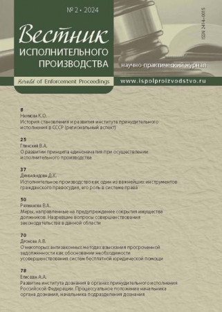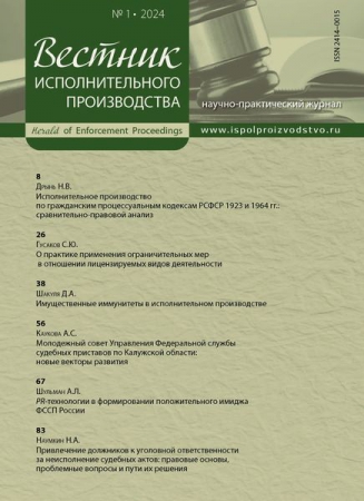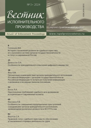 Научно-практический журнал «Вестник исполнительного производства» издается с 2015 года. Выходит 4 раза в год. Издание ориентировано на сферу исполнительного производства, которая во всех государствах, во все исторические эпохи играла и играет ключевую роль в механизме реализации индивидуальных правовых актов.