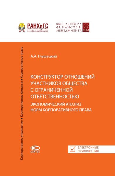 Глушецкий, А. А. Конструктор отношений участников общества с ограниченной ответственностью: экономический анализ норм корпоративного права / А. А. Глушецкий. — Москва : Статут, 2023. — 280 c. — ISBN 978-5-8354-1911-1. — Текст : электронный // Цифровой образовательный ресурс IPR SMART : [сайт]. — URL: https://www.iprbookshop.ru/147783.html (дата обращения: 05.02.2025). — Режим доступа: для авторизир. пользователей