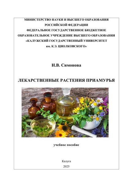 Симонова, Н. В. Лекарственные растения Приамурья : учебное пособие / Н. В. Симонова. — Калуга : Калужский государственный университет им. К.Э. Циолковского, 2025. — 435 c. — ISBN 978-5-88725-771-6. — Текст : электронный // Цифровой образовательный ресурс IPR SMART : [сайт]. — URL: https://www.iprbookshop.ru/148514.html (дата обращения: 27.02.2025). — Режим доступа: для авторизир. пользователей