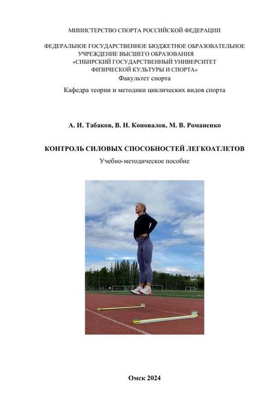 Табаков, А. И. Контроль силовых способностей легкоатлетов : учебно-методическое пособие / А. И. Табаков, В. Н. Коновалов, М. В. Романенко. — Омск : Сибирский государственный университет физической культуры и спорта, 2024. — 92 c. — ISBN 978-5-91930-275-9. — Текст : электронный // Цифровой образовательный ресурс IPR SMART : [сайт]. — URL: https://www.iprbookshop.ru/148715.html (дата обращения: 10.03.2025). — Режим доступа: для авторизир. пользователей