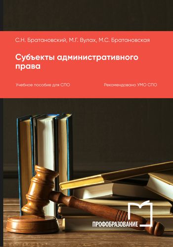 Братановский, С. Н. Субъекты административного права : учебное пособие для СПО / С. Н. Братановский, М. Г. Вулах, М. С. Братановская. — Саратов, Москва : Профобразование, Ай Пи Ар Медиа, 2025. — 123 c. — ISBN 978-5-4488-2473-9, 978-5-4497-4233-9. — Текст : электронный // Цифровой образовательный ресурс IPR SMART : [сайт]. — URL: https://www.iprbookshop.ru/149422.html (дата обращения: 16.04.2025). — Режим доступа: для авторизир. пользователей