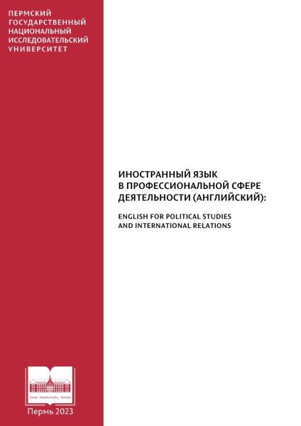 Иностранный язык в профессиональной сфере деятельности (английский): English for Political Studies and International relations : учебно-методическое пособие / составители В. С. Абрамова, М. Ю. Фирстова. — Пермь : Пермский государственный национальный исследовательский университет, 2023. — 188 c. — ISBN 978-5-7944-4049-2. — Текст : электронный // Цифровой образовательный ресурс IPR SMART : [сайт]. — URL: https://www.iprbookshop.ru/149605.html (дата обращения: 01.04.2025). — Режим доступа: для авторизир. пользователей