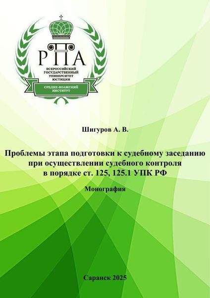 Шигуров, А. В. Проблемы этапа подготовки к судебному заседанию при осуществлении судебного контроля в порядке ст. 125, 125.1 УПК РФ : монография / А. В. Шигуров. — Саранск : Средне-Волжский институт (филиал) ВГУЮ (РПА Минюста России), 2025. — 238 c. — ISBN 978-5-6050658-5-2. — Текст : электронный // Цифровой образовательный ресурс IPR SMART : [сайт]. — URL: https://www.iprbookshop.ru/149838.html (дата обращения: 06.04.2025). — Режим доступа: для авторизир. пользователей