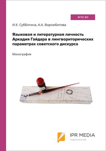 Субботина, И. К. Языковая и литературная личность Аркадия Гайдара в лингвориторических параметрах советского дискурса : монография / И. К. Субботина, А. А. Ворожбитова. — 2-е изд. — Москва : Ай Пи Ар Медиа, 2025. — 206 c. — ISBN 978-5-4497-4341-1. — Текст : электронный // Цифровой образовательный ресурс IPR SMART : [сайт]. — URL: https://www.iprbookshop.ru/150142.html (дата обращения: 17.04.2025). — Режим доступа: для авторизир. пользователей