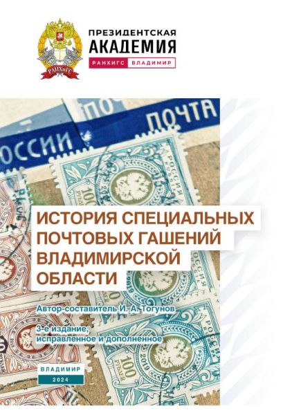 Тогунов, И. А. История специальных почтовых гашений Владимирской области / И. А. Тогунов. — 3-е изд. — Владимир : Владимирский филиал РАНХиГС, 2024. — 199 c. — ISBN 978-5-907789-08-1. — Текст : электронный // Цифровой образовательный ресурс IPR SMART : [сайт]. — URL: https://www.iprbookshop.ru/150863.html (дата обращения: 13.05.2025). — Режим доступа: для авторизир. пользователей
