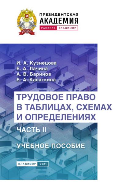 Трудовое право в таблицах, схемах и определениях. Ч.II : учебное пособие / И. А. Кузнецова, Е. А. Лачина, А. В. Баринов, Е. А. Касаткина. — Владимир : Владимирский филиал РАНХиГС, 2024. — 214 c. — ISBN 978-5-907789-04-3. — Текст : электронный // Цифровой образовательный ресурс IPR SMART : [сайт]. — URL: https://www.iprbookshop.ru/150924.html (дата обращения: 13.05.2025). — Режим доступа: для авторизир. пользователей