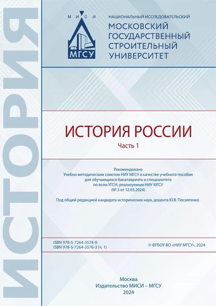История России. В 2 частях. Ч.1 : учебное пособие для обучающихся бакалавриата и специалитета по всем УГСН, реализуемым НИУ МГСУ / О. М. Бызова, К. Н. Гацунаев, Ю. В. Посвятенко, И. П. Прядко ; под редакцией Ю. В. Посвятенко. — Москва : МИСИ-МГСУ, ЭБС АСВ, 2024. — 89 c. — ISBN 978-5-7264-3574-9, 978-5-7264-3576-3 (ч.1). — Текст : электронный // Цифровой образовательный ресурс IPR SMART : [сайт]. — URL: https://www.iprbookshop.ru/151112.html (дата обращения: 20.05.2025). — Режим доступа: для авторизир. пользователей